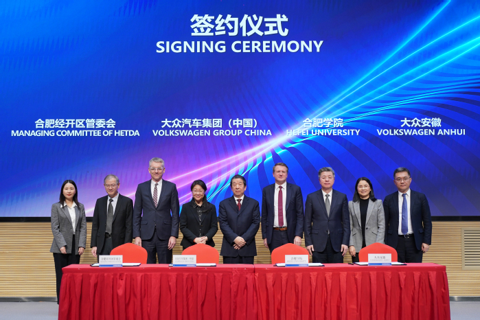 为推动产教深度融合、校企协同育人,打造“双元制”高等教育合作范例,2月20日,大众学院签约揭牌仪式在合肥市中德合作创新园隆重举办。大众汽车集团(中国)执行副总裁傅勤彦(Jens Pfitzinger),大众汽车(安徽)有限公司首席执行官葛皖镝(Erwin Gabardi),合肥学院党委书记王其东,合肥市委常委路军,省委教育工委委员、省教育厅副厅长储常连出席仪式并致辞。仪式由合肥学院院长吴春梅主持。