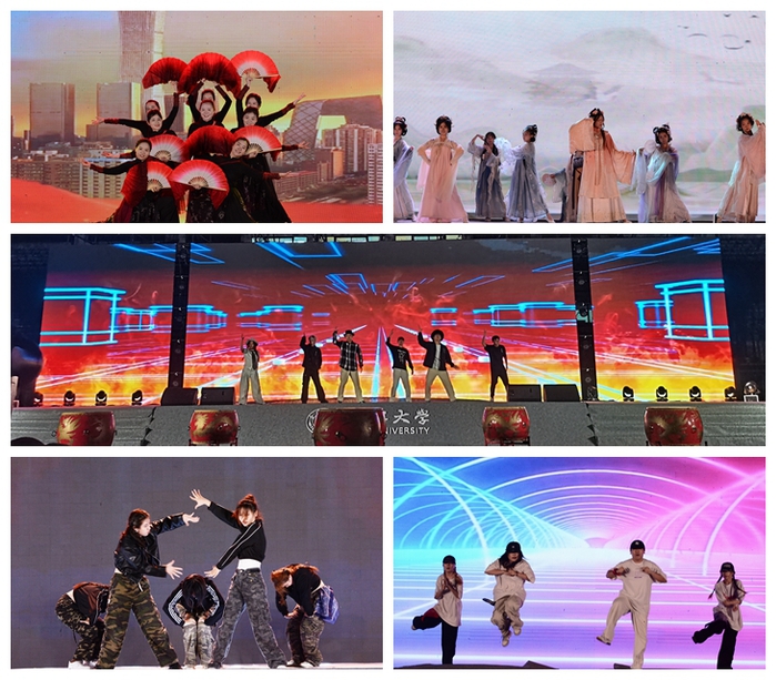 随着音乐缓缓响起,一场活力四射的啦啦操表演瞬间点燃了现场的热情,晚会正式拉开帷幕。节目精彩纷呈,高潮迭起。大学生艺术团以精湛的技艺演绎了《大鱼》与《奢香夫人》的器乐联奏,悠扬的旋律仿佛穿越时空的隧道,带领观众遨游于梦幻的音乐海洋。武术与舞龙舞狮俱乐部强强联手,带来了震撼人心的《狮舞华章》表演,传统武术与现代舞狮的完美融合,让观众领略到了中华文化的博大精深与无限魅力。FD舞蹈俱乐部带来的舞蹈《象王行》活力四射,舞者们用灵动的舞姿展现了大学生的青春活力与激情。校合唱团和教育学院合唱团共同演唱的《我和我的祖国》将现场气氛推向了最高潮。全体观众深情合唱,用歌声表达对祖国的热爱与祝福。