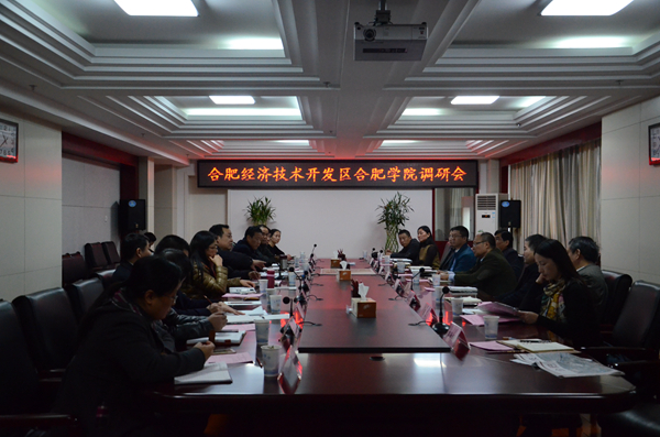 12月1日,合肥经济技术开发区管委会工委书记、管委会副主任杨伟,工委委员、管委会副主任孙余洲等一行十人来我校调研。校党委书记蔡敬民,纪委书记洪家友,副校长陈秀,督导郑永红等在行政楼九楼东会议室接待来宾,双方就支持合肥学院建设等事宜展开深入交流。校办、宣传部、教务处、科技处、公管处、校园建设与管理处等部门负责人陪同与会。