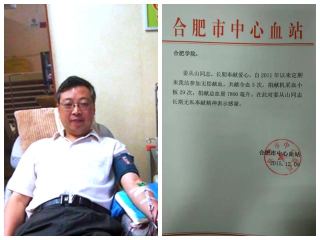 姜从山曾荣获2014—2015年度“无偿献血贡献金奖”,该奖是以两年为限,献血小板达40个治疗量以上,方有资格获得。目前,姜从山已经是合肥市注册志愿者,每年至少志愿服务30小时。姜老师还经常利用双休日赴合肥南站、大学城献血屋等地进行志愿服务。合肥市中心血站曾经给姜老师寄了一封感谢信,感谢姜老师这些年的无偿献血。